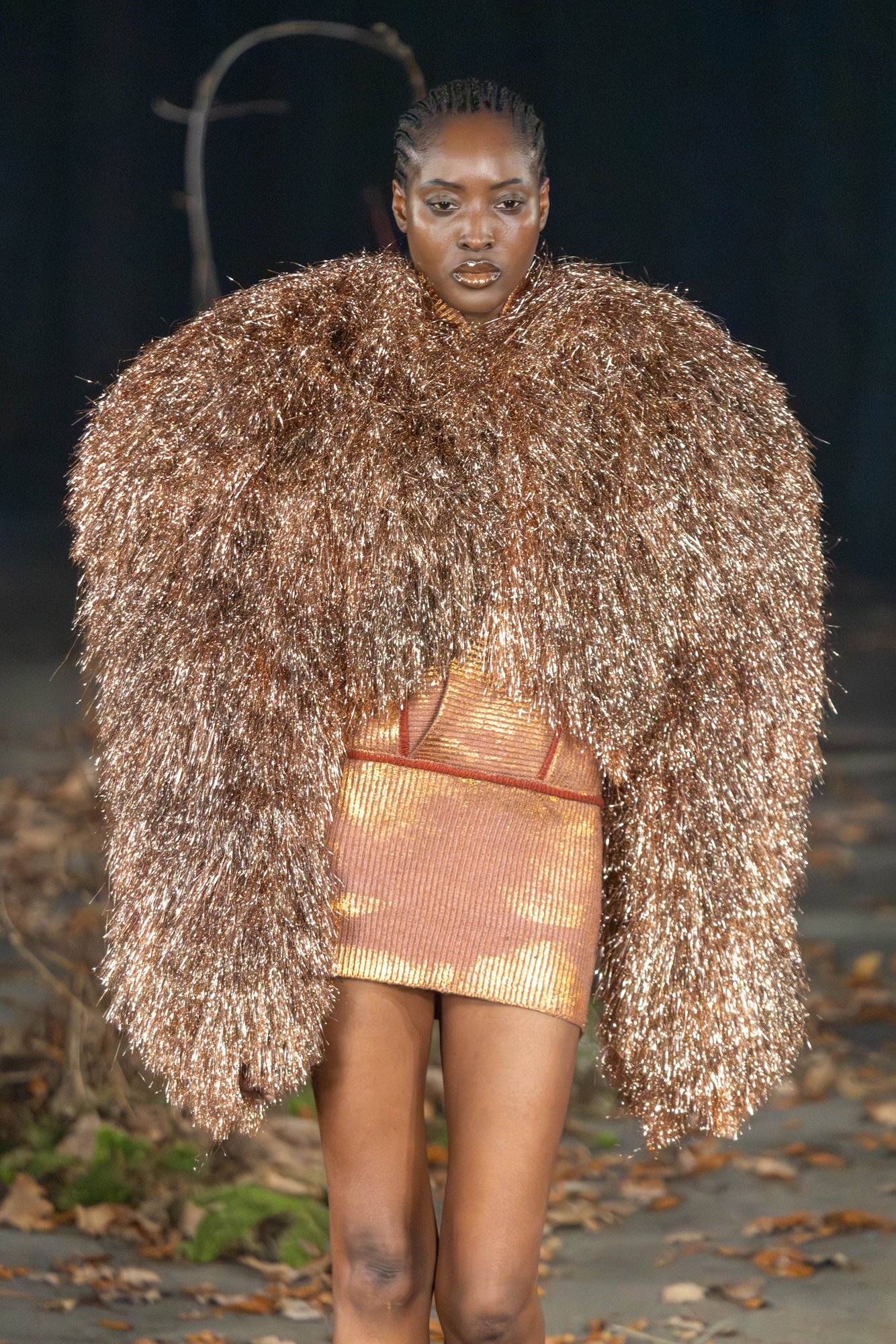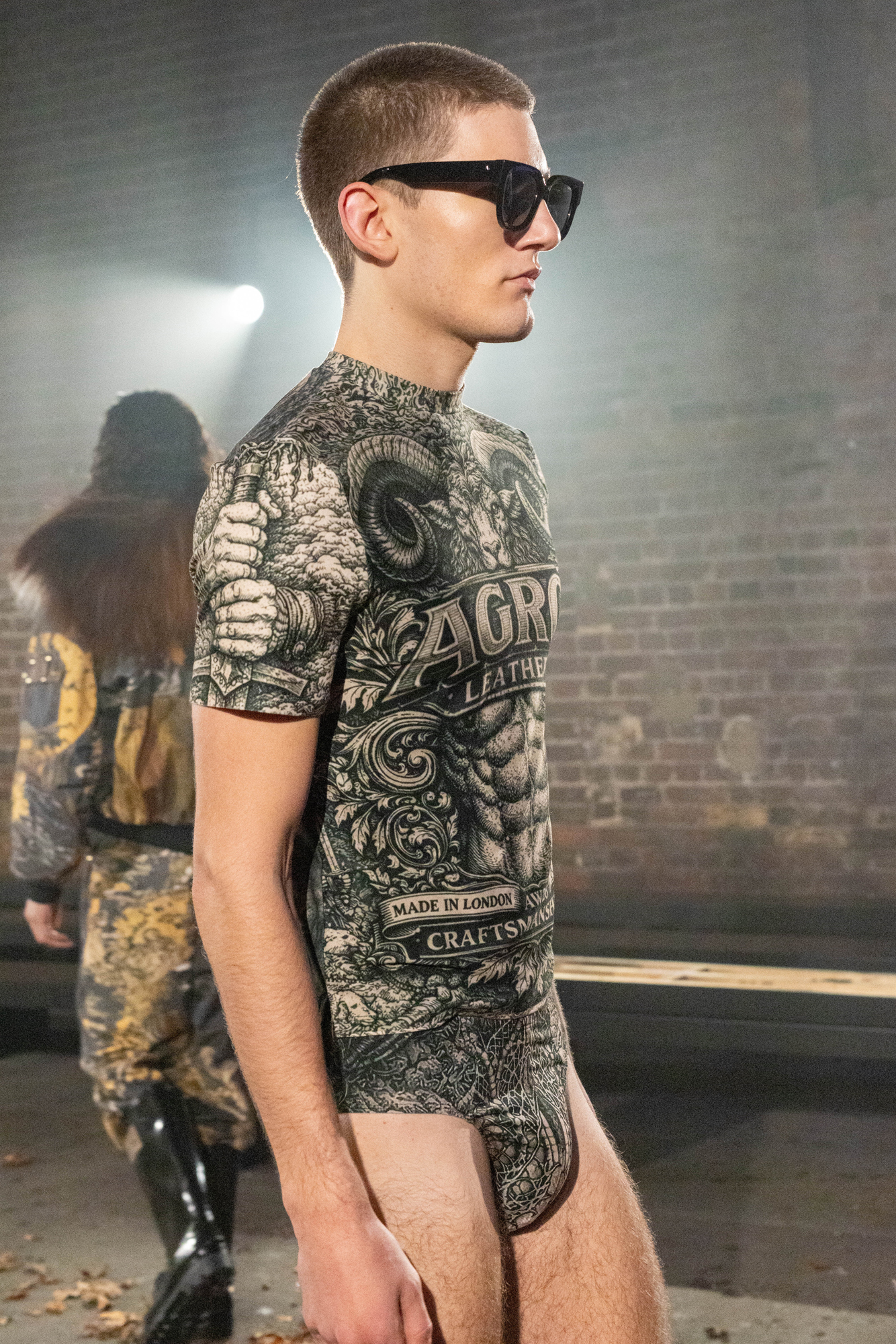 Icelandic sheepskin came in rust, grey and black. Leather aviators, ripstop and hand dyed knits layered up against glossy, armour-like metallics. Ram and bull motifs stamped across denim and leather nodded to old Americana labels, reworked through a darker, folkloric lens. The trompe l’oeil body prints felt knowingly bold, like strength worn right on the surface.