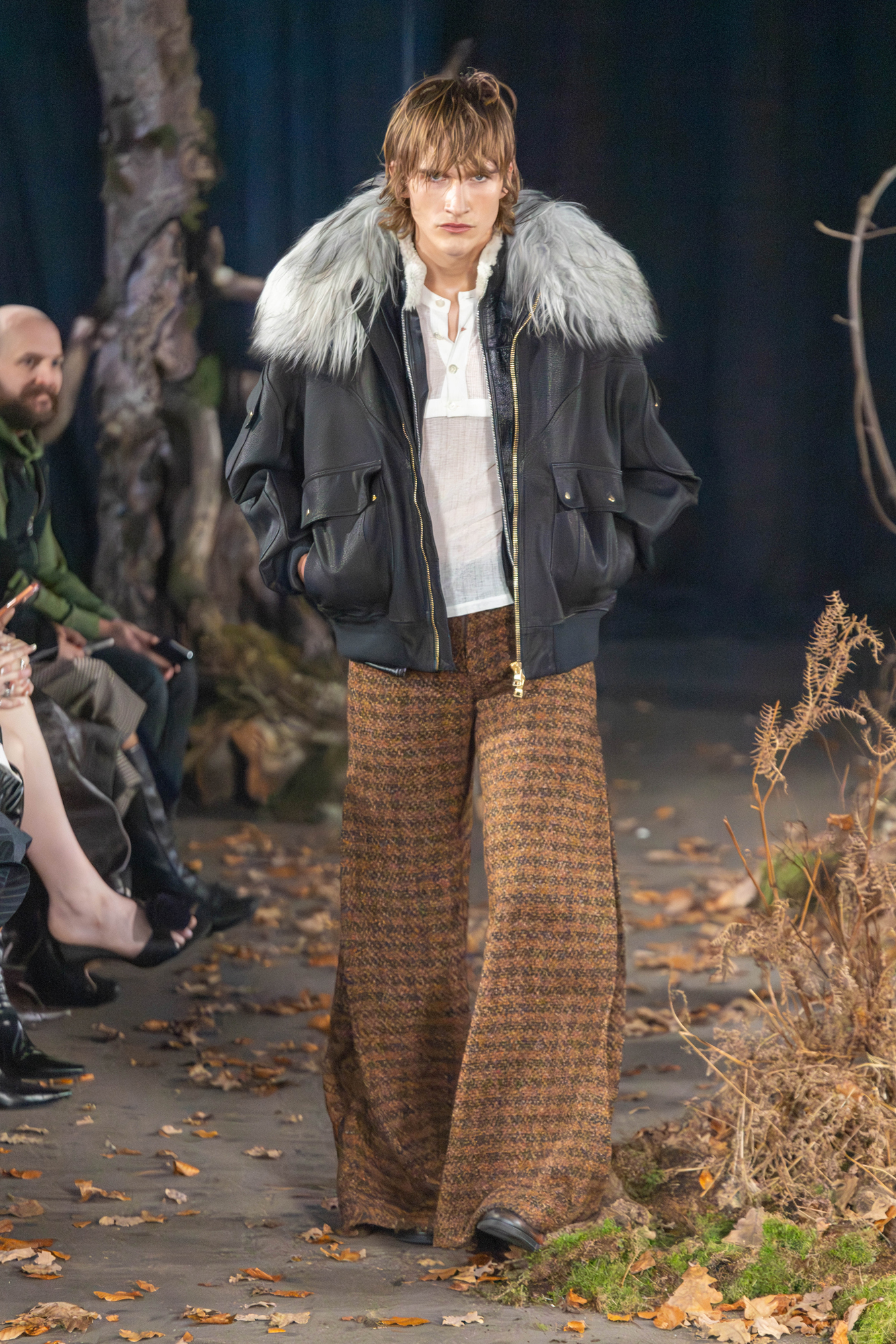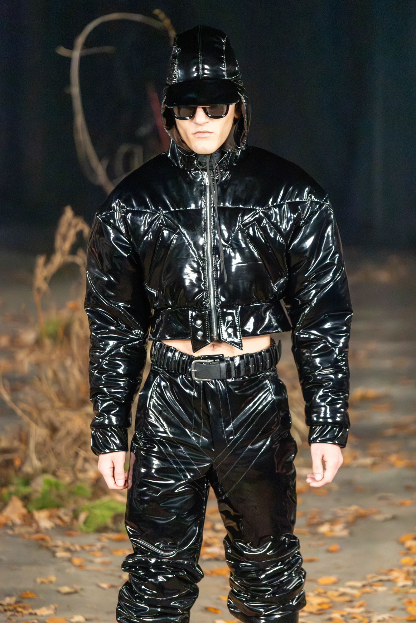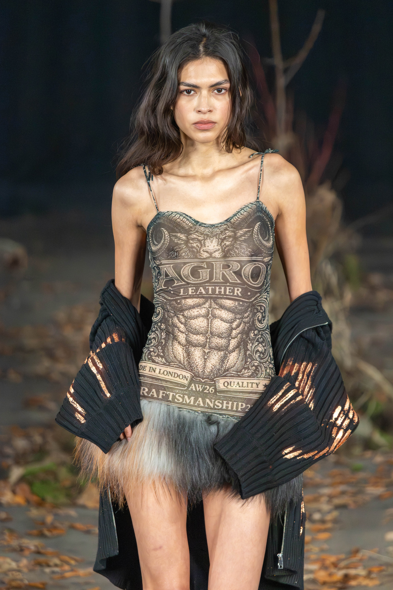For AW26, AGRO Studio stepped into The Wanderer, a cast of characters caught between myth and motion. The runway was scattered with leaves and framed by tree trunks, giving the whole show a restless, slightly feral energy.