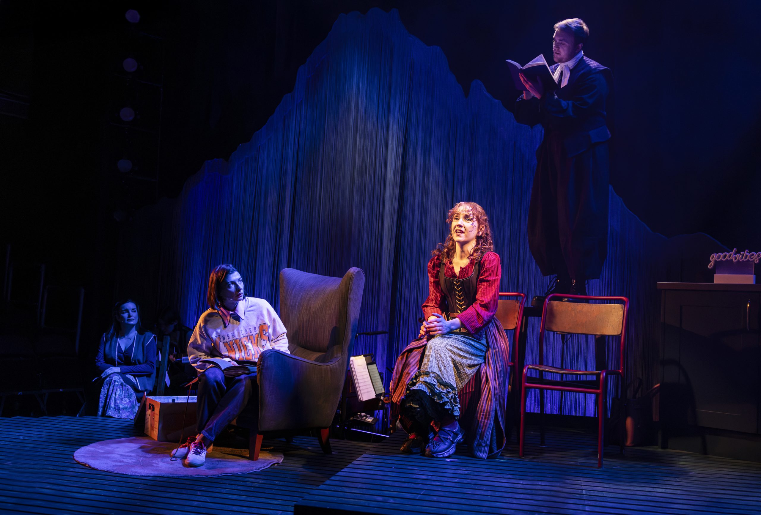 Walking into the intimate space of this small (but mighty) theatre, I was immediately struck by the set. TK Hay’s design strikes exactly the right chord – a backdrop of mountain ranges formed from tasselled string, gently stepped decking with a doorway to nowhere at the top, a comfy chair, a few versatile pieces of furniture, and a beautiful boat-shaped wooden frame suspended above. Everything feels rustic and natural, evoking journeys across land and sea, and perfectly tuned to what’s about to unfold.